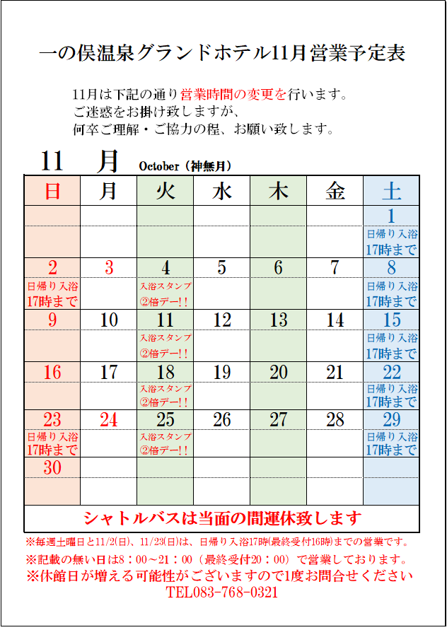 随時、新着情報および館内営業予定カレンダーなどでお知らせ致します。