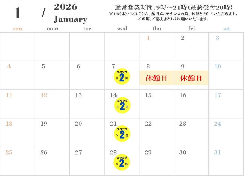 1月は、8日・9日と館内メンテナンスの為、休館致します。